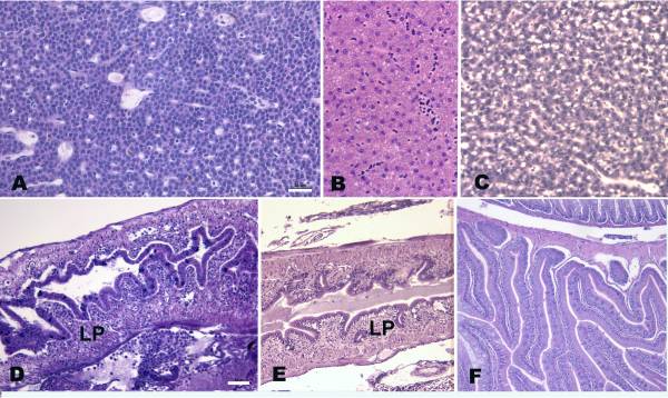 Figure 1. Liver and intestine of fish with Starvation Syndrome (SS) compared to normal. H&E. A. Liver of fish with SS. Note greatly reduced cytoplasm to nucleus ratio in all hepatocytes. Bar = 20 µm. B. Liver from normal male, with more prominent cytoplasm in hepatocytes. C. Liver from normal female, with typically more basophilic cytoplasm compared to males. D, E. Intestines of two fish with SS. Note reduced height of intestinal plates and prominent, diffuse, chronic inflammation of underlying lamina propria (LP). Bar = 50 µm. F. Intestine from normal fish with prominent intestinal plates.